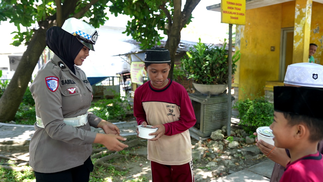 Tak kalah mengharukan, beberapa bocah berpeci yang baru keluar dari masjid tampak sumringah sambil berkata lirih, “Terima kasih, Bu Polisi.” ucapnya.