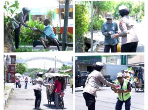 Di salah satu sudut jalan, seorang pedagang keliling tampak berhenti sejenak ketika dihampiri seorang Polwan yang menyodorkan paket makanan sambil tersenyum ramah. “Terima kasih, Bu. Rezeki hari ini,” ucapnya