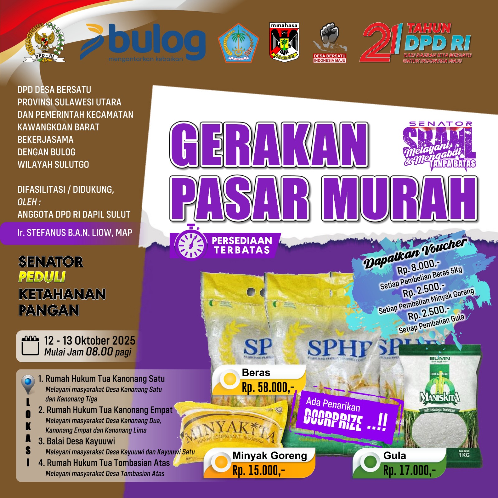 Minahasa- Liputan Warta Jatim, Perayaan HUT Ke-21 Dewan Perwakilan Daerah Republik Indonesia (DPD RI) yang jatuh tanggal 1 Oktober 2025 mengedepankan “Program Senator Peduli Ketahanan Pangan”. Dalam momentum perayaan tersebut di Sulut, Senator Stefa (SBANL) Anggota DPD RI Dapil Sulut Ir. Sefanus BAN Liow, MAP mendukung dan mengfasilitasi langsung pasar murah yang digelar DPD Desa Bersatu Provinsi Sulut dan Pemerintah Kecamatan Kawangkoan Barat Kabupaten Minahasa bekerjsama dengan Bulog Wilayah Sulut-Go.